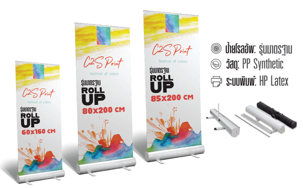 เรามี ขนาดป้ายโรลอัพ ให้เลือกหลากหลาย เช่น **60×160 เซนติเมตร** สำหรับพื้นที่ขนาดเล็ก หรือ **80×200 เซนติเมตร**, **85×200 เซนติเมตร** สำหรับการแสดงข้อมูลที่มากขึ้นในพื้นที่ขนาดใหญ่ คุณสามารถปรับแต่งขนาดและกราฟิกได้ตามต้องการ